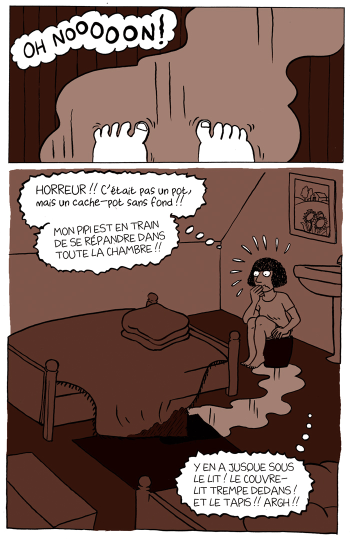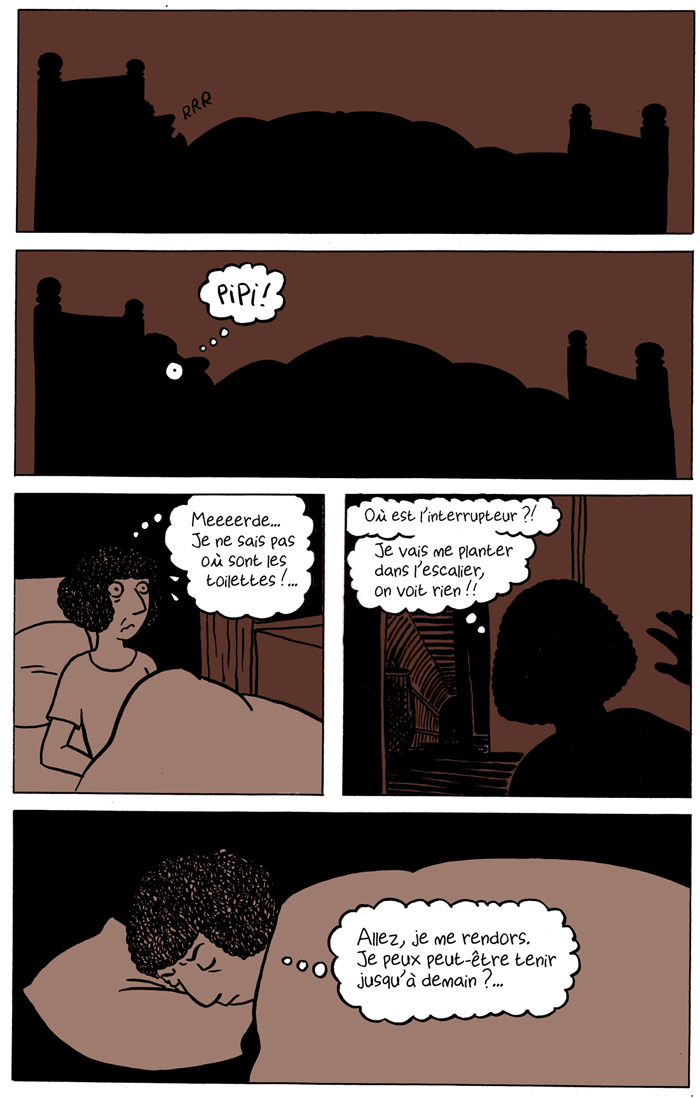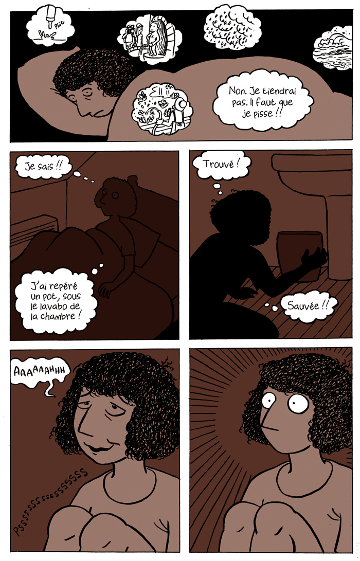 Adulte: « j’y peux rien donc je vais aux chiottes et puis tant pis, j’en voudrais pas à mon pote s’il me réveillait pour ça. ».