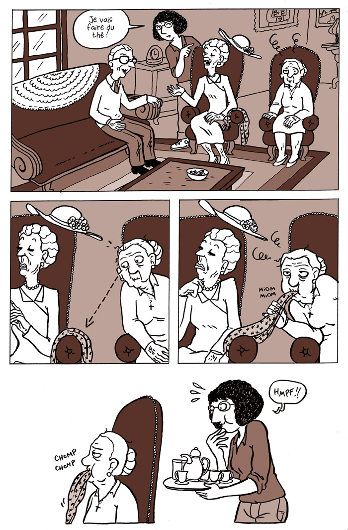 La mémé qui broute le foulard ressemble furieusement à ma biquette quand elle rumine, avec la même lueur d’intelligence au fond (vraiment tout au fond) du regard.