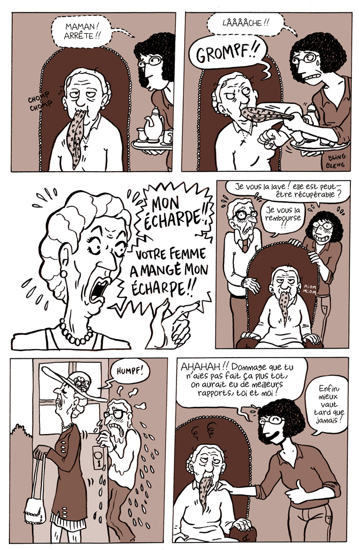 Trop drôle comme anecdote! Et très bien dessiné, moi aussi j’adore l’expression « ruminant » de la dame hermèssophage … au fait, ça a bon goût un foulard Hermès?