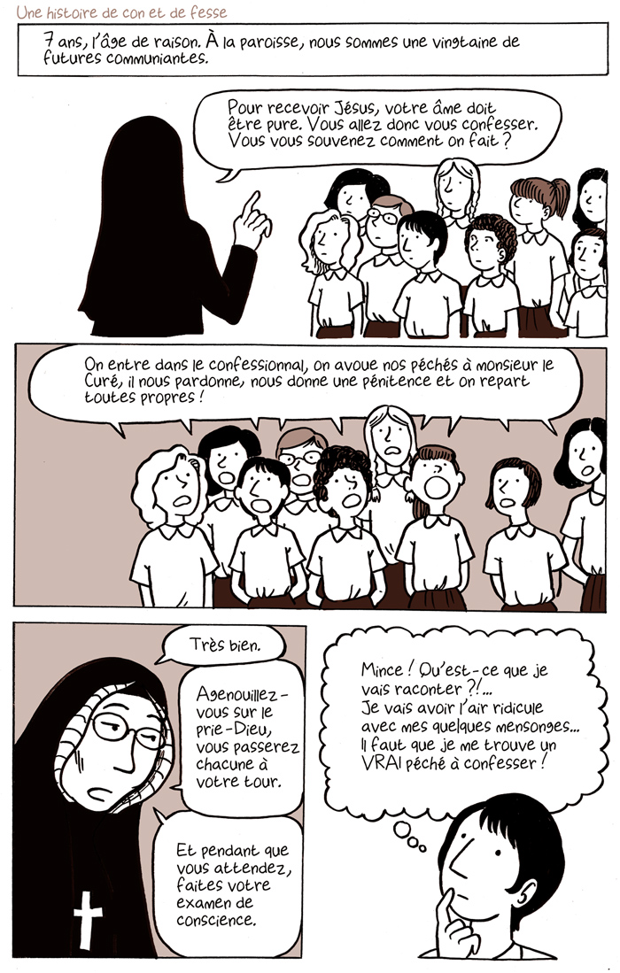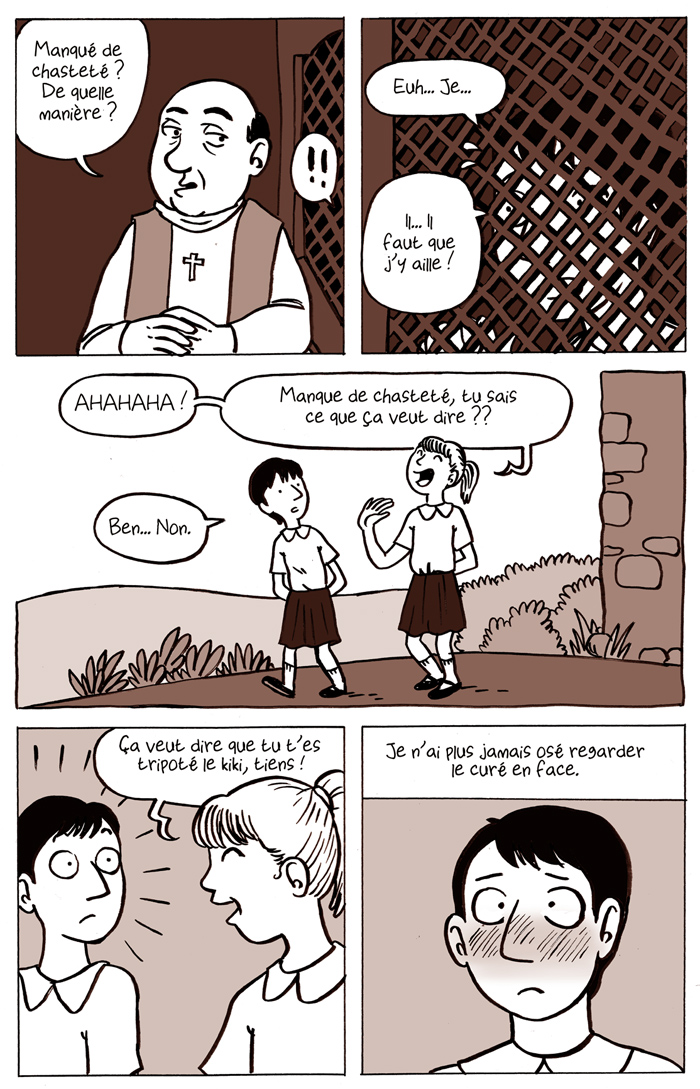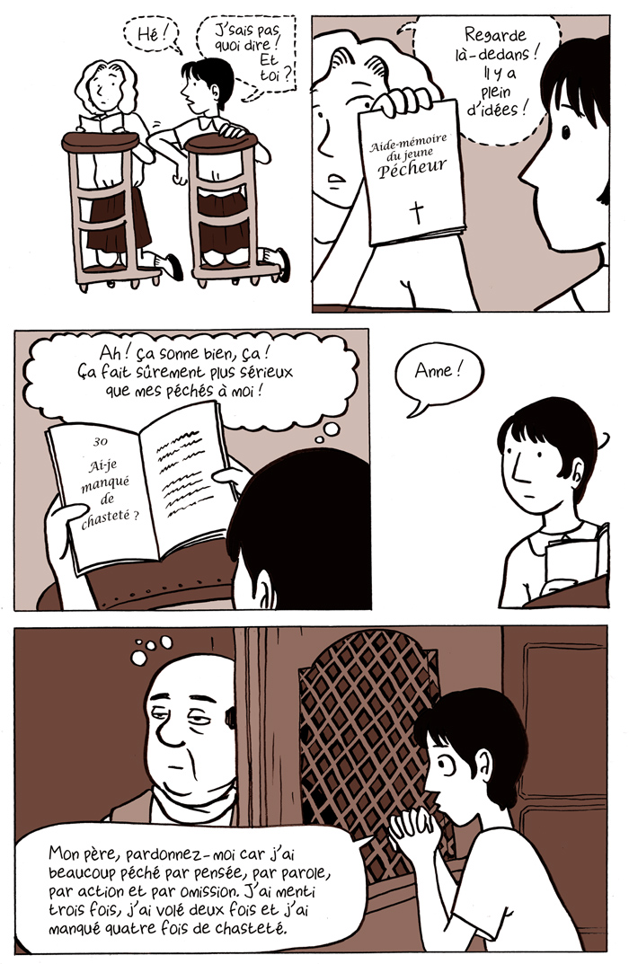 Ahah! Ma mère était aussi dans une école de bonnes-soeurs, et elle aussi inventait des péchés pour que le curé soit content… Elle aussi est devenue athée comme une cuillère, en grandissant.