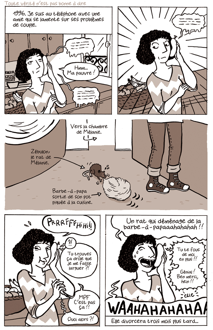 @ Chris : Il y a quelque temps, on trouvait de la barbe-à-papa en méga-pot de plastique transparent, dans les magasins discount, et plus rarement en grande surface. J’adorais ça. Comme dit plus haut, le rat en a bavé, au propre comme au figuré, puisque ce truc fond dès qu’il est un peu humide, ça a dû être vraiment déroutant pour lui, et du coup hilarant pour Gudule.