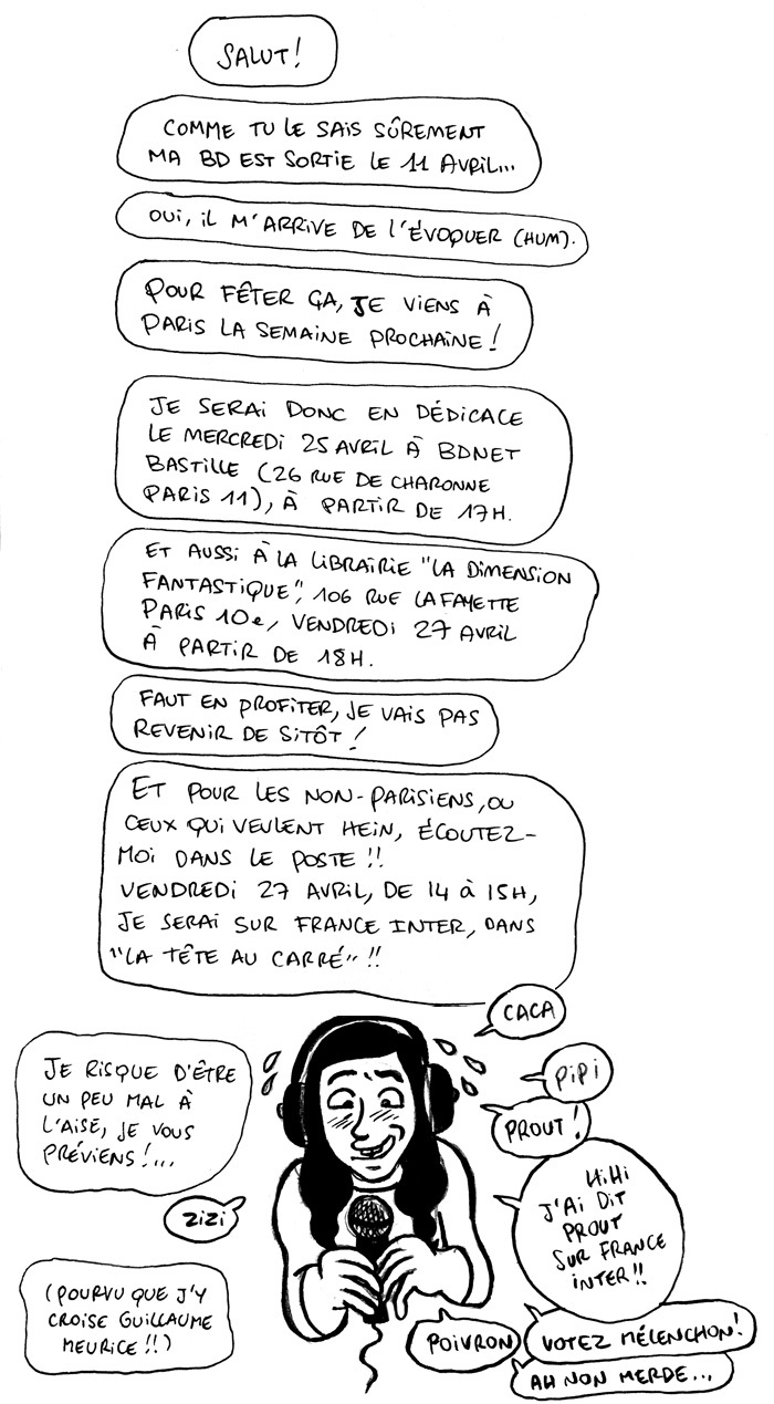 Bon alors, euh, selon toute probabilité, en fait, je ne passerai pas à la tête au carré pour cause de pas le même animateur que d’habitude (Mathieu Vidard sera remplacé) et changement de thème de dernière minute… Fuck !! Cela dit mon attachée de presse est en train de voir avec France Inter pour éventuellement me placer dans une autre émission (pourvu que Par Jupiter veuille bien de moi !! Charliiiiine, alleeeeez, invite-moiiiiiii, j’ai plein de trucs à diiiire)