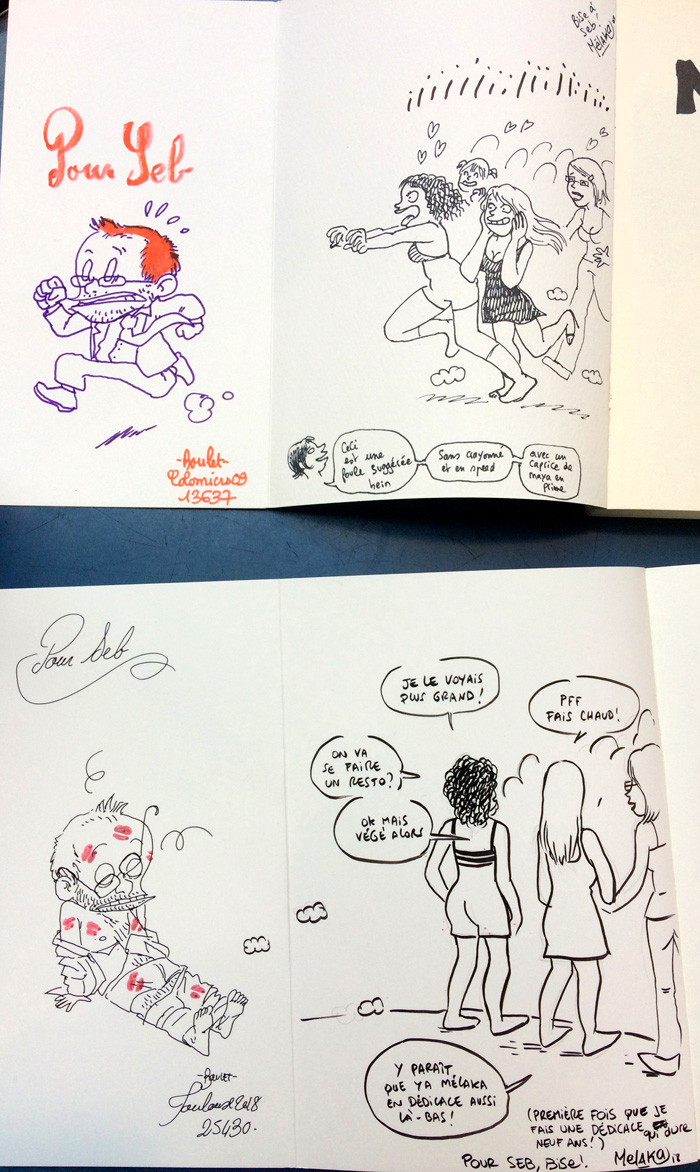 Le propriétaire des livres sur lesquels nous avons dessiné Boulet et moi était très amusé : il y a neuf ans, à Colomiers (dans un festival où j’étais juste squatteuse il me semble), après avoir obtenu sa dédicace du rouquin, il m’avise et me demande de la compléter.