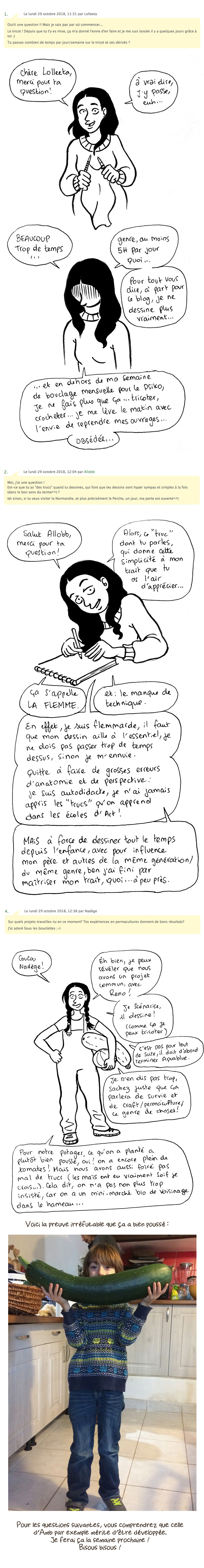 Faudrait arreter de poster quand t’es bourre, t’es pas tres clair et en plus t’es vraiment sexiste. Je sais pas si t’as remarque mais le blog parle de tricot, des enfants qui grandissent, des deboires a la campagne, et un peu de politique. Bref il y a pas mal de lectrices, et les « blagues » du genre « mister freeze » ou sur « la charpente » ben ca le fait pas.