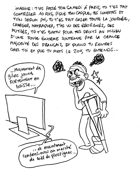 Les journaux télévisés, les chaînes d’infos, je croyais naïvement qu’ils avaient une certaine neutralité journalistique. Quand même. Mais depuis le début du mouvement, et en particulier depuis le 1er décembre, ce ne sont plus des chaînes d’info, mais de propagande ! Leur volonté d’influencer l’opinion publique ne se cache même plus, c’est hallucinant ! Ils perdent toute crédibilité, quand ils nous serinent une semaine entière qu’il ne faut surtout pas sortir de chez soi le samedi suivant, que des hordes de tueurs vont descendre sur la capitale pour vous égorger, que les forces de l’ordre se sont multipliées telles des petites bactéries ! Et quand le samedi en question passe, ils enchaînent sur le mode « Oh regardez le mouvement s’étouffe, lalala, tout va bien, c’est oublié, retournez bosser maintenant, y a noël qui arrive, allez vite vite dépenser votre pognon que vous n’avez pas dans les magasins ! ». Une telle dichotomie dans le ton, dans le propos, ça ne vous paraît pas juste ÉNORME ? Et je ne parle pas du traitement ABUSIF des pauuuvres commerçants des Champs-Elysées qui se sont fait vandaliser et vont devoir faire appel à leurs assurances, des pauuuvres commerçants qui ne vont pas bien vendre cette année pour Noël (ben oui, les gens sont pauvres !), de la pauuuuvre croissance française qui, oh, malheur ! risque de stagner un peu cette année.