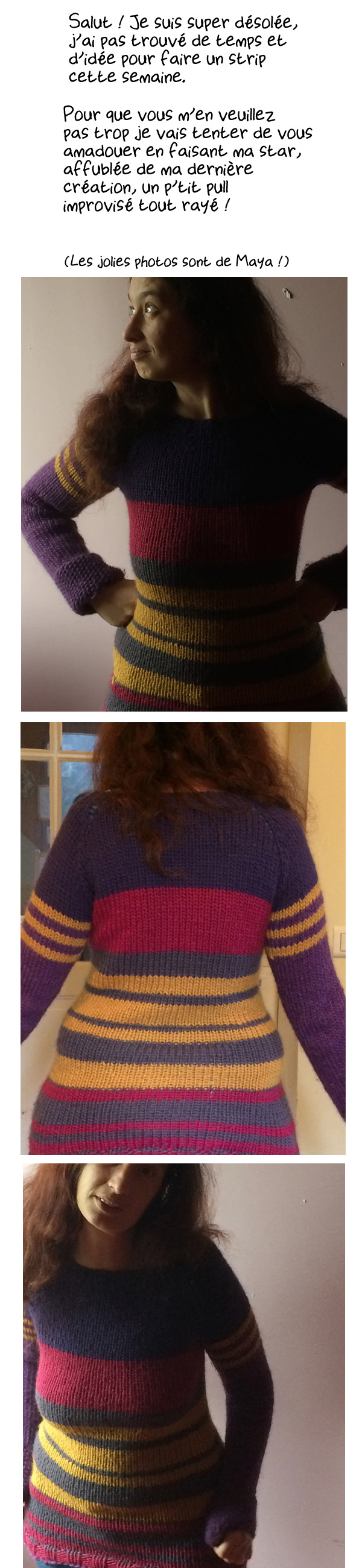 Je suis impressionnée par ta rapidité d’apprentissage, moi j’ai appris à tricoter à 10 ans et pourtant je n’ai encore jamais fait un pull entier… et improvisé, en plus!