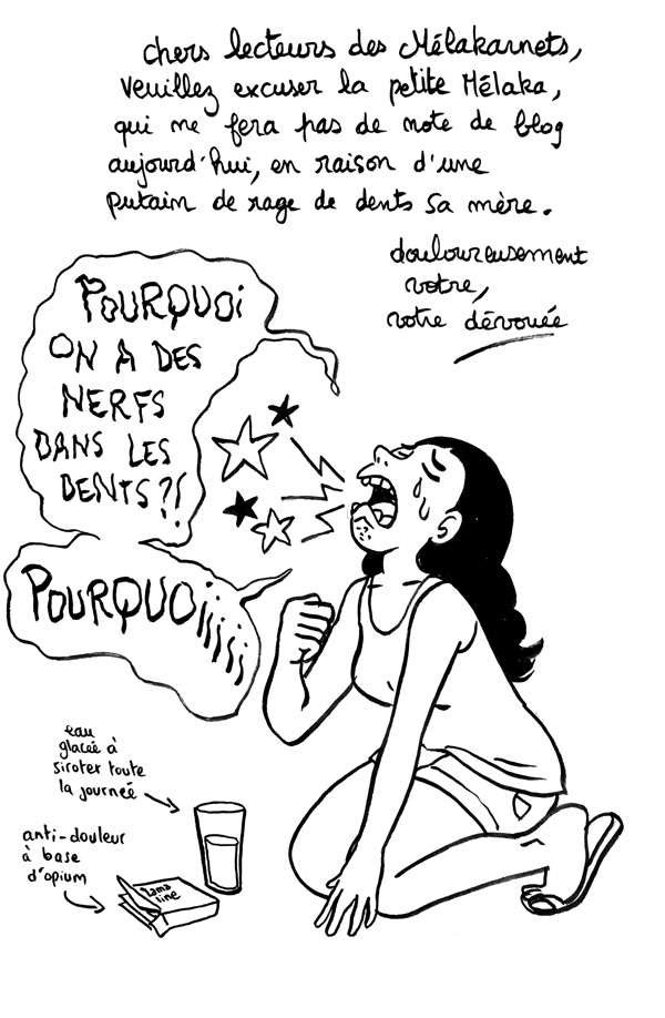 Pour ceux que ça intéresse, j’ai plus mal, la dentiste m’a dévitalisé (encore) une dent. Heureuse parce que plus mal, triste parce qu’il ne reste plus grand chose de vivant là-dedans :'(