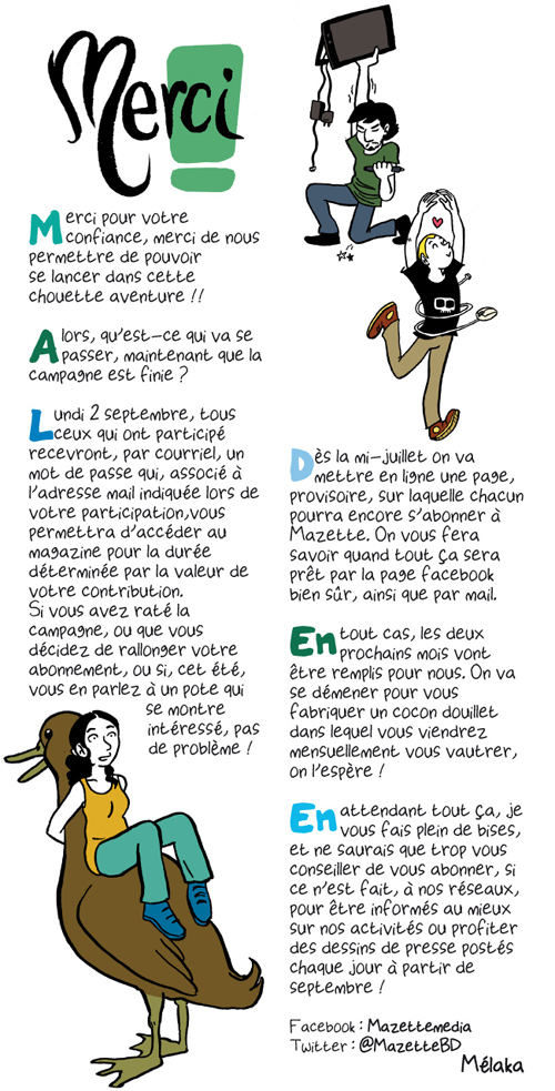 Y a eu plein de couacs de paiement pour ceux qui sont passés par Paypal sur Ulule, je sais pas pourquoi, j’ai les nerfs contre Ulule, ça donne une mauvaise image de Mazette dès le départ, c’est pas cool. On se démène pour régler ça. En attendant, voici la page que j’ai faite et envoyée à tous les contributeurs dès la campagne bouclée :
