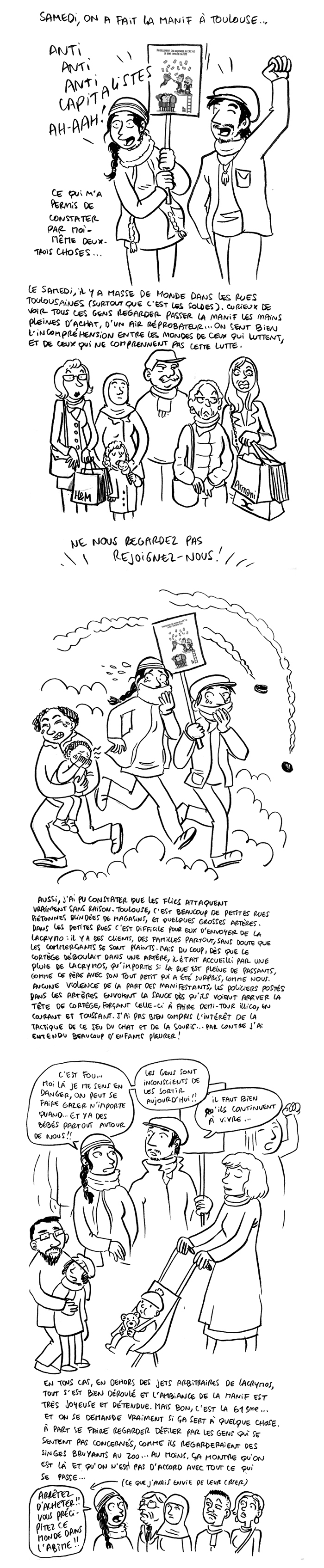 J’ai fait toutes les journées de grève intersyndicale et le trois quarts des manifs, et à longueur de journée j’entends mes collègues dirent des choses odieuses contre le mouvement tout en passant sa journée sur le site d’Adidas… c’est à se taper la tête contre les murs. Surout que c’est pas comme si on était très bien payés ! Comment peuvent-ils dépenser autant de fric là dedans ??