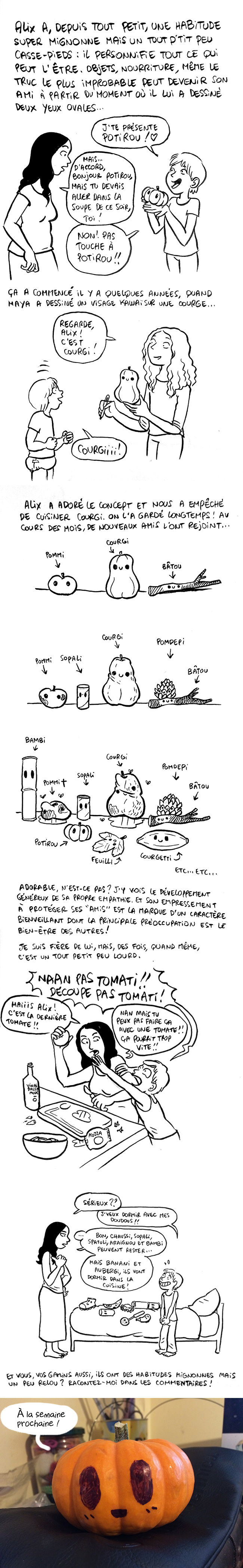 Sinon je l’ai pas précisé dans la bd, mais le top du top c’est quand on tombe sur un fruit ou un légume qui a NATURELLEMENT des petites taches sur la peau qui évoquent un visage. Alors là, il ne me laisse aucun choix et emporte dans sa grotte l’objet de sa paréidolie !