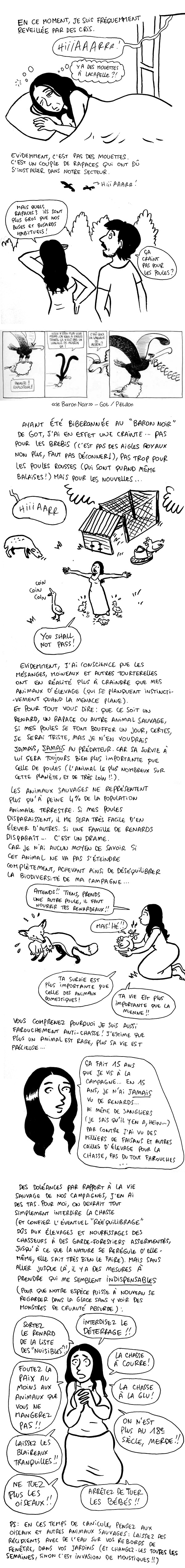 * Cette notion de renards mal éduqués n’est pas anodine. À cause de la chasse, les renards (et maintenant les loups) sont poussés par réflexe de survie de l’espèce à faire deux portées par an, pour compenser les morts. Et alors, il y a de plus en plus de renards (et potentiellement de loups avec la politique actuelle à leur égard) qui sont « lâchés » par leurs parents après une éducation raccourcie, avec une perte progressive des instincts et de la « culture » de l’espèce. Un phénomène de dégénérescence, provoqué par la sur-chasse. Arrêter la chasse aux renards, c’est aussi un moyen de retrouver des renards malins (qui n’ont aucun intérêt à tuer plus que de besoin, et qui n’ont aucun intérêt à voir leurs ressources se tarir), et donc des renards qui peuvent vivre en relative bonne intelligence avec leurs voisins humains.