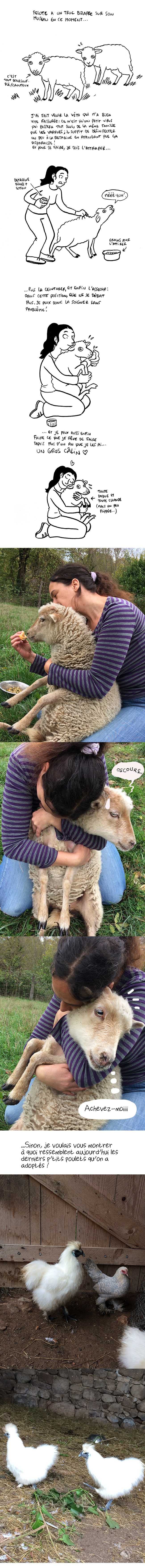 @ Jacques et Chris : Je confirme que les poulets et poulettes peuvent être très sociables et même câlins ! J’ai adopté deux poussins de 15 jours un peu avant Mélaka (dont du coup je suis les péripéties poulesques avec un intérêt particulier) ! Ce sont maintenant un coq et poulette adultes – du même genre, je crois, que la poulette beige et grise de Mélaka, des Pékins. Ils viennent tout le temps voir ce que font les humains, se laissent caresser, restent tranquilles quand on les prend sur les genoux, adorent les gratouilles dans le cou… Pour ma part, j’en ai conclu que ça valait largement un chat 🙂