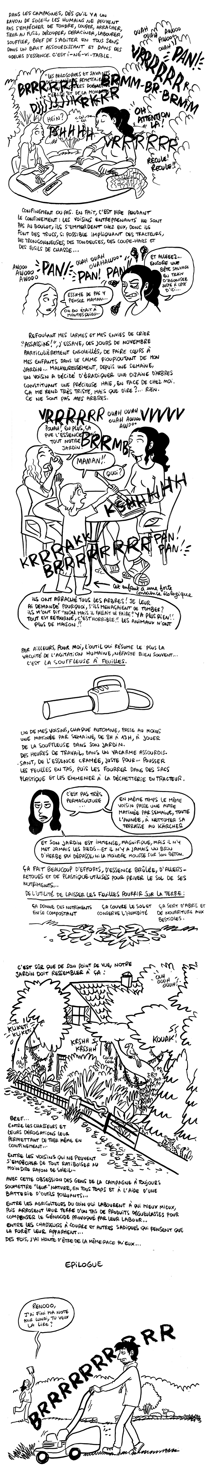 Salut Mélaka ! mais c’est pas possible, on doit être voisines !! c’est exactement pareil chez moi, petit village de 450 âmes dans les Vosges, mais le voisin qui passe la souffleuse à feuilles 1x/semaine (même après la pluie, aller comprendre…), les tondeuses et tronçonneuses et effectivement, c’est sans compter les chasseurs qui me font aussi trembler à chaque coup de fusil qui résonne dans le vallon… et ce ne sont même pas des agriculteurs qui tronçonnent, non, juste des gens qui ont quelques arbres autour de chez eux… juste un besoin de virilité j’imagine, de tenir une machine dangereuse et si possible qui fait beaucoup de bruit, et de l’utiliser au max pour être fier d’avoir bien bossé…. je ne comprends vraiment pas, en habitant dans ce petit paradis, comment on peut en arriver là… et je ne crois pas que ce soit de l’ennui (enfin j’espère pas !)…. mais c’était bien pire durant le 1er confinement, qui avait lieu en plus au printemps, en pleine période de nidification… çà, on était quand même allés voir un voisin qui coupait tous ces arbres, avec signalement à la mairie et à l’OFB…. mais apparemment, il recommence cette semaine. Youpi. Courage à toi, je compatis !