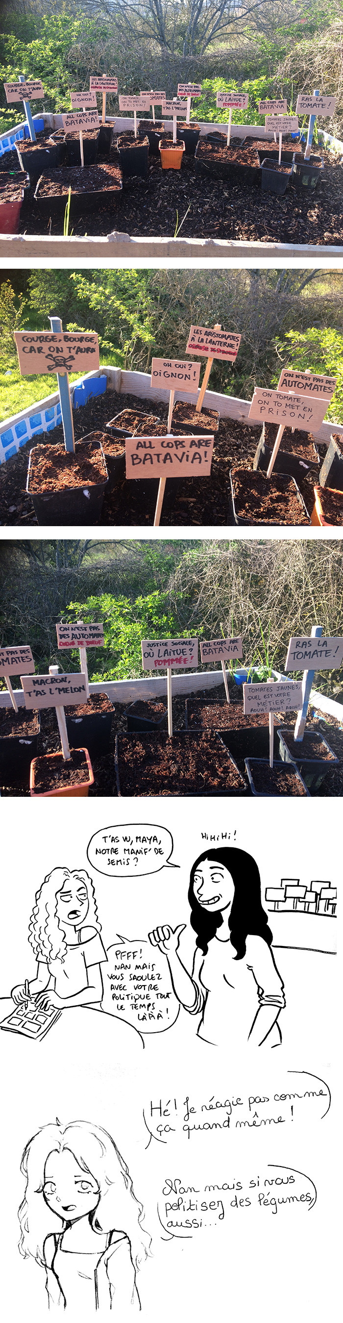 Si Maya lit les commentaires : les étiquettes de plants et semis sont en général chiantes. C’est une corvée. C’est plat. Il faut étiqueter pour savoir qu’est-ce-qu’il y a dans quel emplacement, mais c’est banal, c’est tous les ans une routine, un geste répétitif. Alors que là, avec cette « manif », cette corvée se transforme en objet d’art, en « performance » artistique. Politique oui, mais c’est juste un prétexte, un substrat. L’important, c’est que c’est un détournement très drôle. Ça permet de s’amuser en imaginant des slogans pour chaque étiquette, au lieu de juste recopier encore et toujours un nom de légume. C’est drôle à faire, c’est drôle à voir.