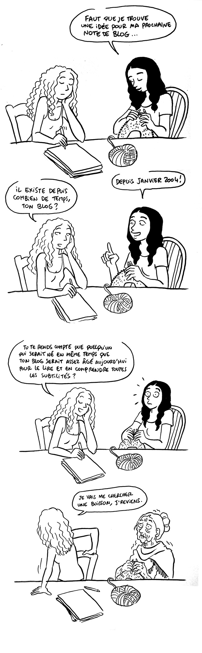 Aujourd’hui, ils sont moins nombreux à poursuivre leurs blogs. Je ne lis plus que Boulet, Laurel et Melaka. Aujourd’hui je voudrais dire merci à tous pour tous les rires, toutes ces histoires, toutes ces belles illustrations, pour toutes ces années à s’émerveiller. Il y a surement encore dans la masse des lecteurs de vieux fidèles comme moi qui, anonymement, continuent à vous suivre, à vous apprécier.