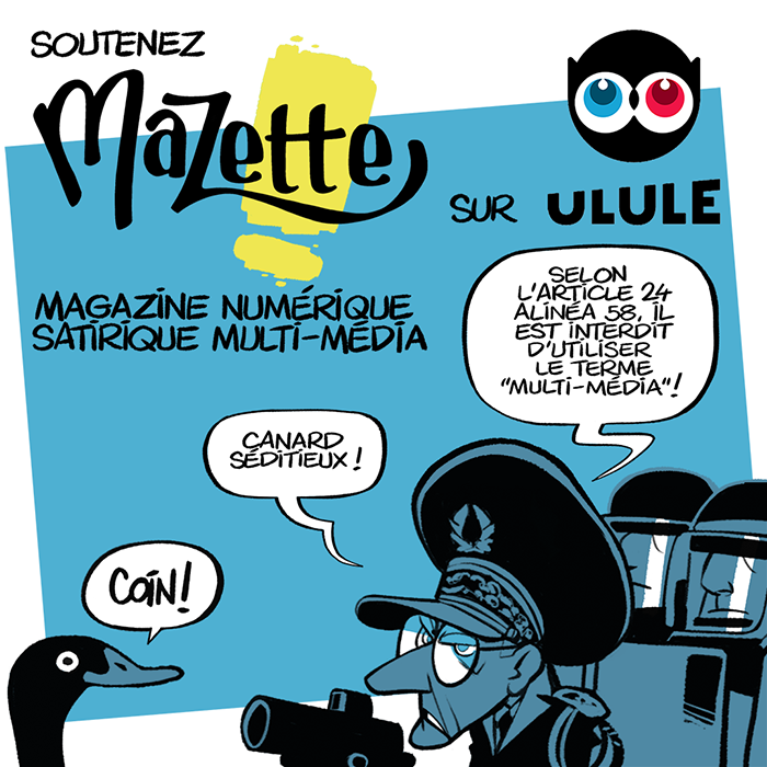 Pour avoir lu Mazette, vous pratiquez un humour qui peut offenser pas mal de gens. C’est une qualité à mes yeux, mais les gens de gauche en ce moment sont divisés comme pas possible, alors réussir à tous leur plaire… Moi quand je lis un truc qui ne me convient pas dans un journal, je l’ignore et je lis le reste. Je sais que d’autres par contre envoient des emails rageux.