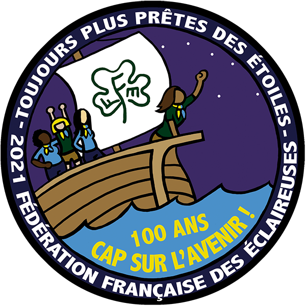 Les scouts… J’avoue, j’avais un à-priori, sans doute à cause de certains vieux films français, voire du Hamster Jovial de Gotlib : je croyais encore que c’était une institution catholique, où la discipline austère était de mise. Mais je me gourrais à fond ! Les éclaireurs et éclaireuses de France, c’est une section absolument laïque, les « respo » (c’est comme ça qu’on dit « mono » maintenant) sont des jeunes qui ont l’air franchement sympas, marrants, l’esprit est hyper cool, populo, et on est bien plus proches d’une colonie de vacances façon « autonomisons les mômes », tendance forêt-camping-feu-de-camp-nature (avec ce petit parfum de débrouillardise), plus proches d’un esprit d’autogestion que d’un esprit militaire ! Et d’un esprit plutôt de gauche, si on doit placer ça sur l’échiquier ; d’ailleurs, le hasard fait bien les choses, il y a très peu de temps, j’ai été contactée par un jeune de l’EEDF (éclaireurs et éclaireuses de France), parce qu’il avait lu et apprécié la bd « l’Avenir en commun ? » qu’on a faite avec Reno, pour me filer un petit boulot de graphisme : j’ai ainsi réalisé le design d’un écusson qui sera brodé, à destination d’une partie féministe de leur institution, les éclaireuses, qui fête leurs 100 ans d’existence. Il n’y a que peu de création personnelle dans ce boulot hein (j’ai fait exactement ce qu’ils m’ont demandé) mais j’avoue, je suis assez fière d’avoir pu travaller pour eux, et j’apprécie la coincidence, du fait qu’ils m’ont contacté alors qu’en parallèle, je les contactais pour mon fiston, sans qu’il n’y ait aucun rapport entre les deux approches 🙂