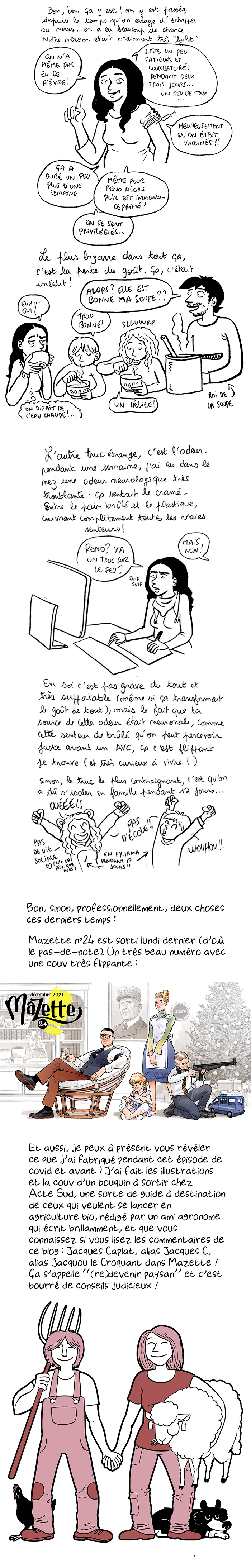 Une odeur de pneu brûlé, non, mélangée à une odeur ferrique? J’avais aussi senti arriver qqchose par le nez, j’ai pris un mouchoir, j’ai pas eu à me forcer pour voir un quart de litre de sang sortir du nez d’un coup. Depuis mars 2020, je n’ai eu vent d’aucun cas présentant ce phénomène qui venait sans doute de mes poumons, le médecin chargé des entrées à l’hôpital ayant refusé catégoriquement mon entrée pendant 10 jours, jusqu’à ce que mon médecin traitant me fasse embarquer rapidement (enfin, rapidement, non, parce qu’ils se sont battus 2h30 pour me faire emmener, les ambulanciers refusant de m’emmener, par peur.) Et là, je suis réinfecté par un virus qui n’est pas celui dont on parle, mais qui est largement plus dangereux si c’est pris tardivement et, à la différence d’il y a dix ans, ça a été justement pris trèèèèèès tard (+ d’un mois au lieu de trois jours). Il y a des jours où on devrait rester au lit!