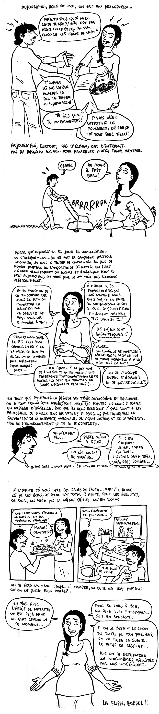 J’ai tellement fait tourner ta BD pour convaincre tout le monde. Et y’avait de l’espoir donc c’est encore plus dur.. j’en suis à espérer qu’une météorite nous tombe dessus pour ne pas avoir à penser à tout ça, comment je vais l’expliquer à mes enfants? Donc les législatives lui.. essayons ça. Merci d’avoir essayé de ton côté!!
