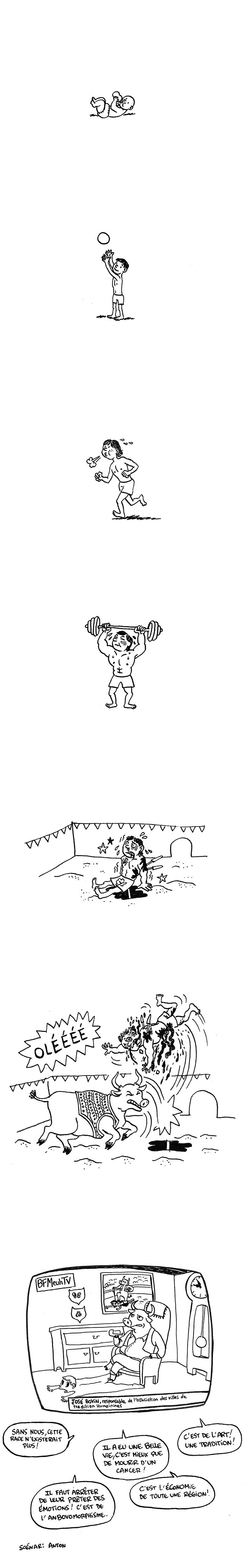 La torture et la mise à mort d’animaux dans quelques départements, alors qu’elles tombent sous le coup de la loi et sont punies partout ailleurs en France, no way, c’est juste incompréhensible. Aucune excuse, aucune justification hypocrite de fichue tradition n’est admissible. Marie Sara (ex-torera) a dit « Un taureau ne souffre pas. Il est là pour donner la mort et pour combattre ». Là, on rejoint les dessins de Méla, il faudrait voir si Marie gardait toute sa combativité avec quelques harpons fichés dans ses quartiers arrières.