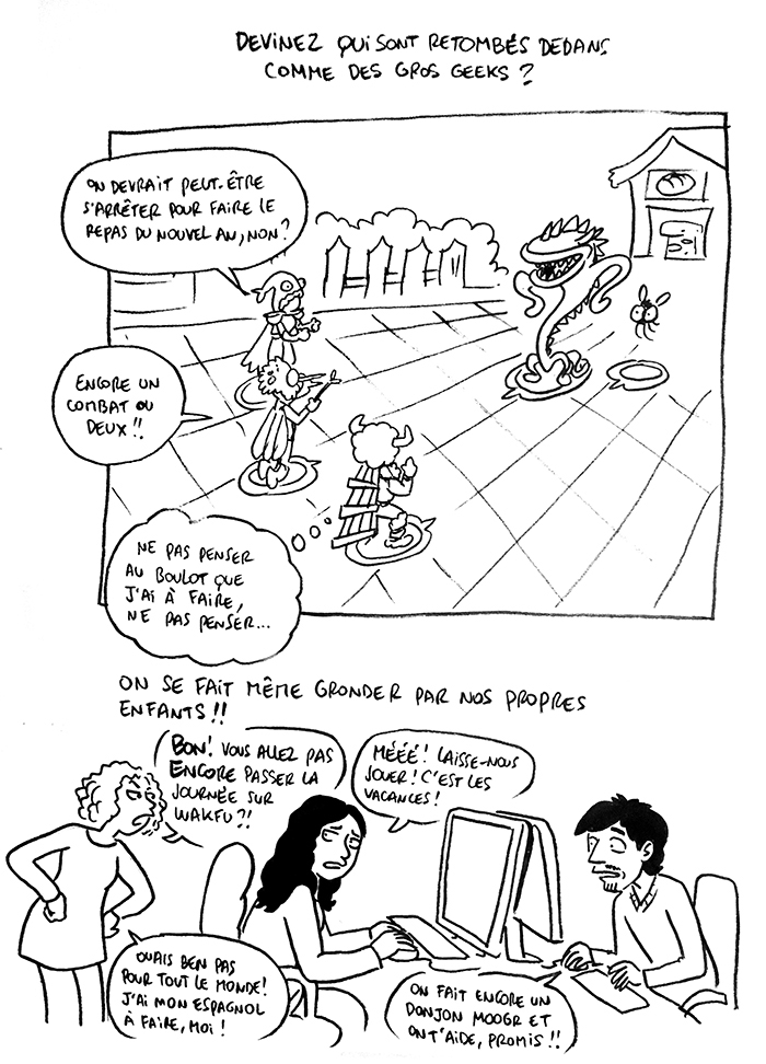 Nous avions découvert le MMO Dofus à sa version béta, quand il avait encore des aspects très « amateur », alors que nous n’avions pas encore d’enfant, et que nous étions fraîchement installés dans le tarn. Nous y avons passé des centaines et des centaines d’heures, nous avons attendu pendant des années Dofus 2.0, un événement ! beaucoup plus beau, plus riche… Nous avons littéralement grandi avec ce jeu (même si nous étions déjà adultes quand on l’a découvert hein). Quand enfin Wakfu est arrivé, avec ses « écosystèmes », on s’y est épanouis. Entretemps, on a eu des enfants, on a moins joué, on a eu des petits retours de flamme entre de grandes périodes sans y mettre un pied, mais de fait, plus nos enfants grandissaient et moins on trouvait le temps/l’intérêt pour ce jeu. Mais, régulièrement, ça nous chatouillait, on avait envie de retrouver les plaines d’Amakna ou de Sufokia, remplies de bébêtes bizarres et marrantes. Car, oui, jamais nous n’avons trouvé d’univers ludique aussi chouette. Les MMO, il y en a plein, mais ils sont tous trop sérieux / prétentieux / classiques, et aucun, jamais, ne nous a séduits comme ceux inventés par Tot et sa bande, légers, rigolos, plein de jeux de mots plus ou moins scabreux, et addictifs comme pas deux. Depuis quasiment 20 ans que les jeux d’Ankama existent sur le marché, personne, à nos yeux, n’a su prendre la relève ; ça tombe bien, Dofus et Wakfu sont encore là, prêts à nous acceuillir à nouveau n’importe quand !