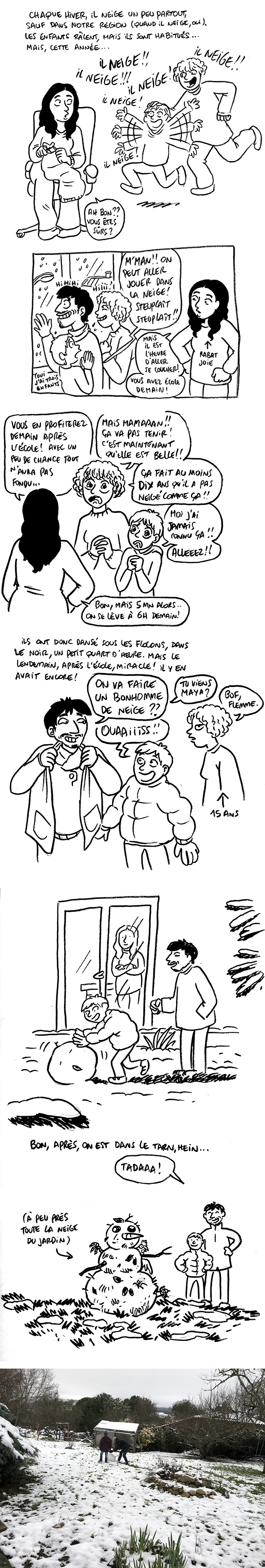 Excellent ! Tout le monde redevient instantanément enfant à la première neige… Surtout quand il ne neige pas souvent. Et tu retranscris ça très bien en BD. 🙂