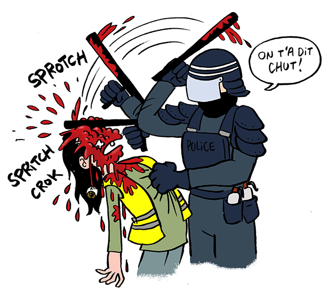 La colère monte, monte, elle gronde partout, soulevant de plus en plus de monde. Et la violence policière explose, en réponse. Parce que c’est bien connu, pour calmer les ardeurs d’une personne désespérée, rien ne vaut un bon coup de matraque dans la gueule !