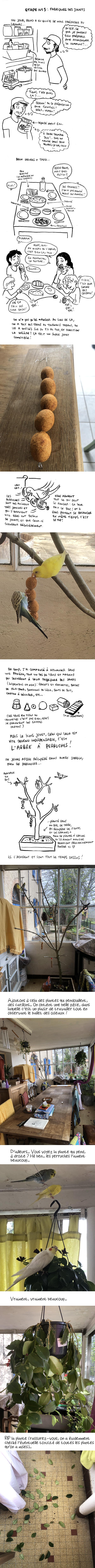 Ah, oui ! on m’a posé la question dans une note précédente d’ailleurs, et j’ai oublié de répondre… Bon, on savait, en donnant cet usage à cette pièce, que la question se poserait, d’où les tissus un peu partout pour protéger les meubles. Pour le reste, je passe le balais tous les jours (parce qu’il n’y a pas que les fientes : il y a énormément de graines, débris de feuilles, poussières, ces bébêtes salissent beaucoup !), et pour ce qui est des fientes, on limite la casse dans le fait qu’elles squattent essentiellement sur leur cage (les cacas tombent dedans), sur l’arbre à perruches (quand elles sont près du centre, les cacas tombent dans le bac de terre), mais inévitablement, il y a des petites fientes sur le carrelage à certains endroits… Bon, c’est des granivores, leurs cacas sont tout petits, bien moins « sales » que celui des poules qui mangent de tout, par exemple. Donc, je laisse faire, et de temps en temps, un coup de serpillère, quoi. C’est pas parfait, mais bon, c’est pas très grave non plus 🙂 (la pièce est un peu roots de base, heureusement on n’est pas sur du plancher ancien quoi !!)