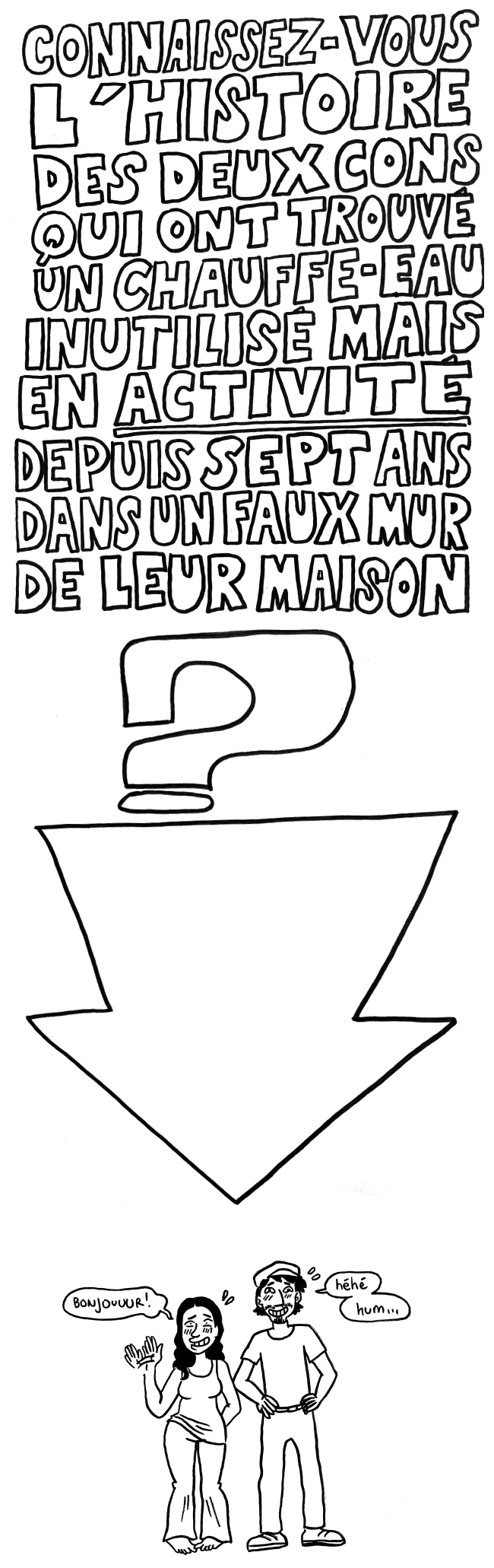 Un petit message à l’ancien-ne proprio du genre: « Bonne nouvelle, on a retrouvé votre chauffe-eau: il était caché dans un faux-mur ! Et devinez quoi ? Il va toujours bon pied bon œil en continu depuis sept ans ! Quelle surprise ! »
