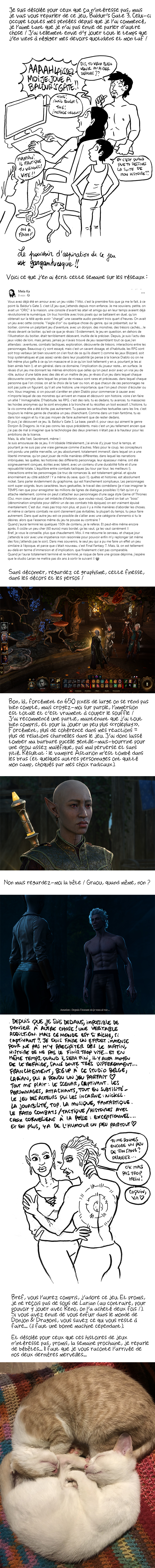 Nemo > Non ça va, j’ai pas trop de gamers puristes dans mes lecteurs en fait uhuhu. Oui, Divinity, c’est prévu, après BG3 je me les achète, il paraît que c’est un poil moins approfondi et c’est aussi un peu plus vieux, mais c’est le même moteur et tu n’es pas le premier à m’en dire du bien 🙂 Par contre les Baldur’s Gate précédents, euh… le 2 date quand même de 1998 d’après Reno, ça doit piquer !!