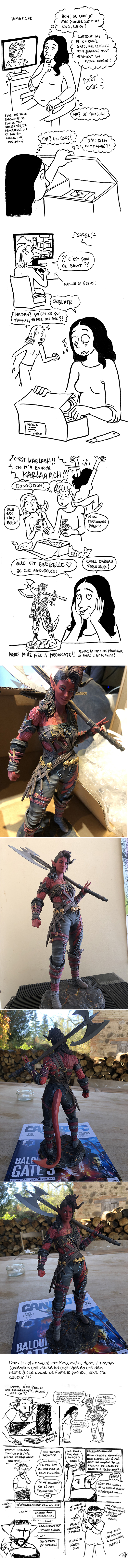 Ni une ni deux, je suis allée frimer sur mon groupe facebook de fans de BG3 (sur lequel je passe beaucoup trop de temps, oui) et les réactions ont été dithyrambiques ! J’en ai donc fait des captures d’écran que j’ai envoyées à Meowcate (qui n’est pas sur facebook, lui). Comme dans ces commentaires, certains exprimaient la brûlante envie d’avoir eux aussi leur figurine Karlach, ce dernier a réalisé une note sur son blog expliquant tout, les étapes de fabrication, les démarches et contraintes, et établissant un barême de prix. Comme sa note est super intéressante, je vous la linke ici.