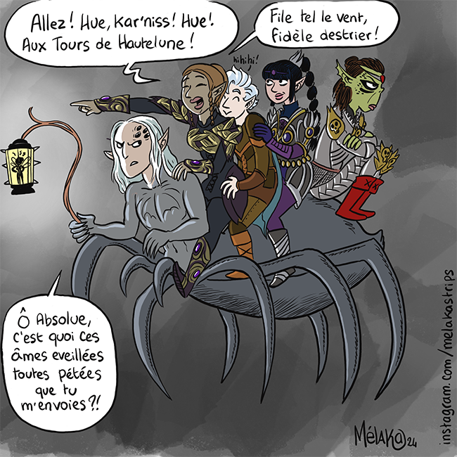 Pour mon anniversaire, Reno m’a offert un ipad pro. C’est pile ce qu’il me fallait pour me filer un coup de pied au derche, question dessin : j’en rêvais, et, à force de voir de partout sur mes réseaux sociaux des fan arts de mon obsession Balduresque, je complexais à mort avec mes ptits dessins-sur-carnet qu’il faut scanner, nettoyer sur photoshop et tout le bazar. Enfin, Procreate à portée de main, ce logiciel de dessin tant apprécié des illustrateurs, et à raison ! Il est effectivement extrêmement agréable à utiliser et instinctif… Du coup, depuis que j’ai cet ipad, je n’ai fait que dessiner. Je me suis mis en tête d’exploiter cette obsession, cette connaissance totale que j’ai de ce jeu, des multiples arcanes de son scénario, pour faire une série de strips et dessins autour du monde extrêmement riche du jeu.