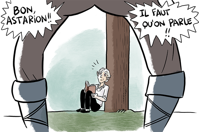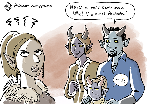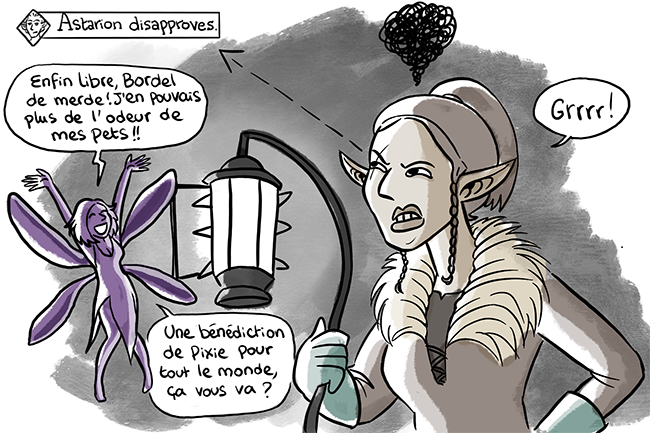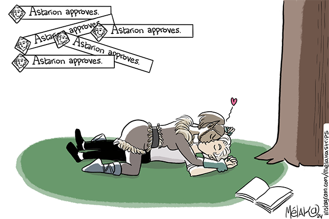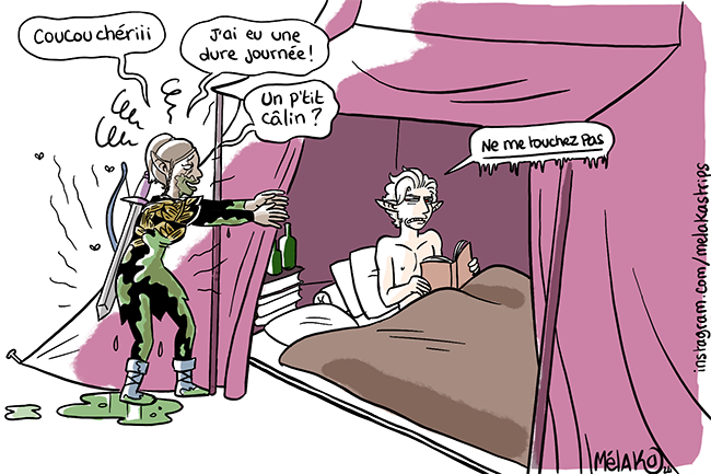 Je pense que ma diffusion de strips autour de BG3 va durer quelques temps (encore désolée pour ceux qui jouent pas et ne vont rien comprendre aux gags !), vu comme je suis branchée là dessus. Il faut dire, j’expérimente ce que ça fait de créer au sein d’une fandom et c’est assez excitant ! Je commence à avoir ma petite réputation dans les groupes de fans et mes dessins n’ont jamais été autant vus, autant partagés, c’est satisfaisant et motivant ! Donc, je continue… J’étais pas contente de ma colo alors j’ai essayé autre chose, ça marche plutôt bien. Après un début un peu difficile, un peu à côté de la plaque graphiquement, je crois que je commence un peu à trouver ma patte pour cette série.. Et au bout du compte, qui sait ? Peut-être arriverais-je à en faire autre chose que juste des bd et dessins gratos répandus sur le net ? On verra… Pour l’instant, je continue de puiser dans ce formidable réservoir d’inspiration et de gags que constitue ce jeu !