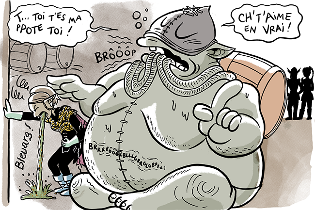 Ouf, vous me rassurez ! je culpabilise toujours de rester dans ce trip là, qui est quand même peu accessible à ceux qui n’ont pas les références… Mais je dois vous avouer que je prends mon pied à dessiner tout ça, ça me change un peu (20 ans que je dessine ma tronche sur ce blog quand même !). Et pour les couleurs, aussi, je trouvé également que ma nouvelle manière de faire est bien plus jolie, plus en phase avec mon trait, et en plus c’est achte plus rapide à faire 🙂
