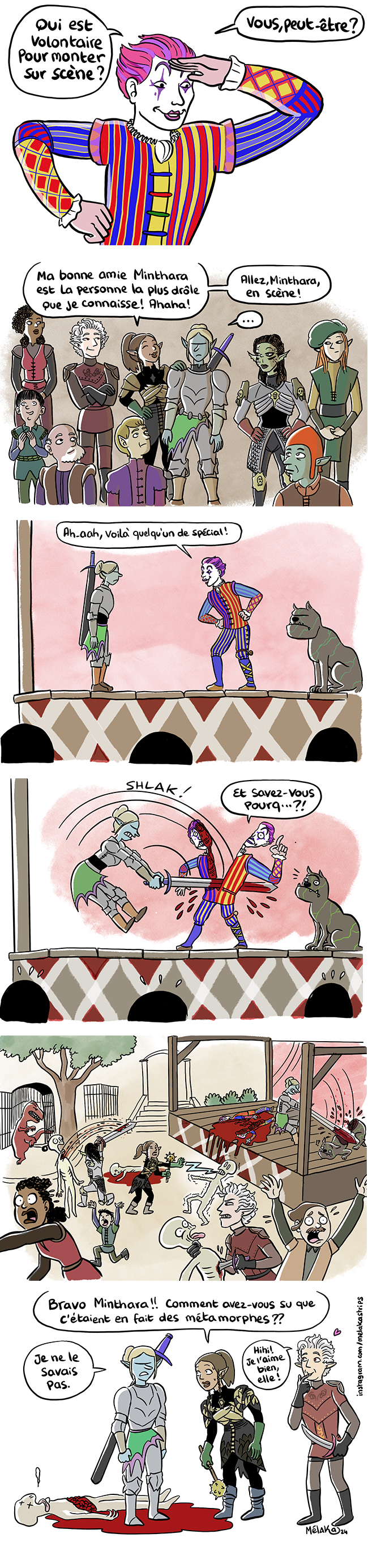 En tout cas j’ai qu’un seul strip à vous présenter. Un strip dans lequel j’introduis un nouveau personnage, Minthara, une drow complètement psychopathe, je l’aime beaucoup <3 J’ai encore quelques scénarios en avance, mais je pense que je vais gentiment lever le pied, même si je suis assez accro aux réactions toujours enthousiastes de la fandom anglophone autour de mon travail !