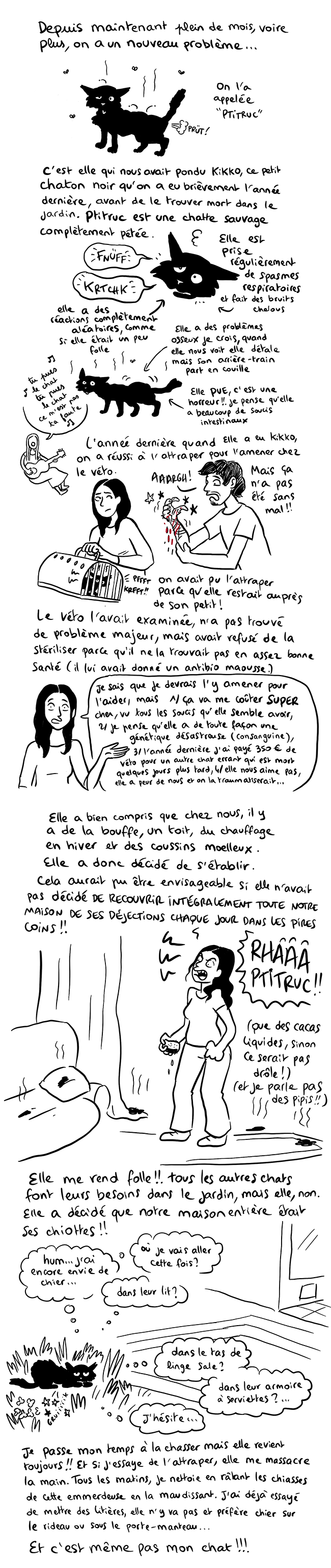 Quelle charmante invitée… ça me rappelle la fois où tu comparais tes chattes à des vieilles dames, mais celle-là, je ne suis pas sûre d’avoir envie de la voir en pleine action ! Courage et moult litres de vinaigre blanc pour nettoyer les œuvres de cette pépette…