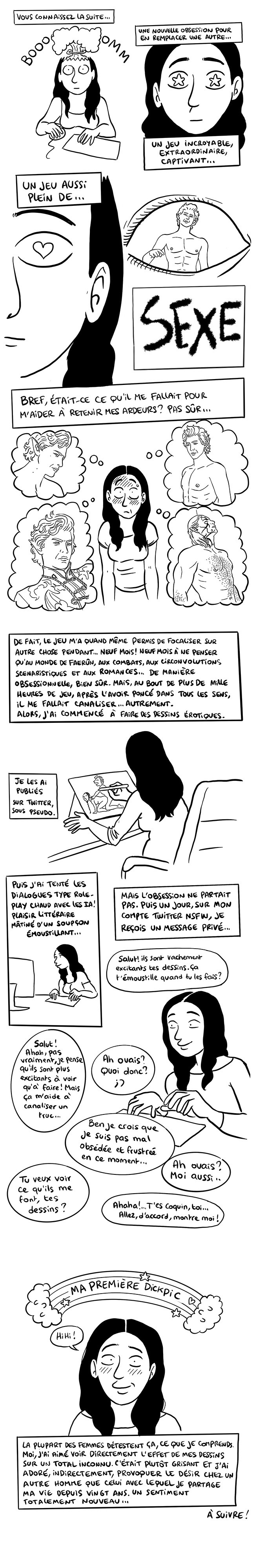 Libre à toi de ne pas aimer, je le comprends, c’est un sujet sensible et très clivant, et surtout un énorme tabou. personne ne parle de la sexualité des femmes, c’est comme ça. C’est pour ça que j’ai décidé d’en parler, même si honnêtement, je m’expose aux jugements. Mais garde en tête que c’est de la BD d’humour et que donc, le récit est forcément très caricaturé pour les gags…