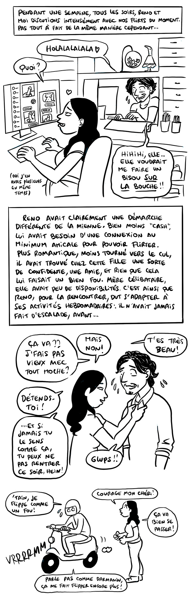 J’ai tendance à penser que ça peut parfaitement sex-pliquer (lauleu), partant d’une observation simple, que d’ailleurs Mélaka montre parfaitement sur les planches précédentes (lorsqu’elle témoigne du nombre de potentielles rencontres qu’elle obtient, qui contraste énormément avec le nombre de femmes intéressées par le profil de Reno :'( ).