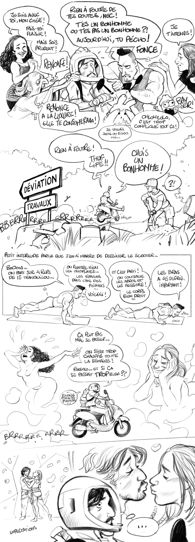 Bonjour! Je viens de lire les différentes pages, c’est très intéressant de voir ainsi du proto-libertinage présenté en bd. C’est vrai que le sexe récréatif est souvent assez mal perçu, même par les progressistes qui y voient facilement une perversion. Je vois que toi, tu as placé la frontière plutôt sur le fait de ne pas baiser avec des électeurs RN ou autres. Avec mon épouse, on s’en fout un peu pas mal, quand on baise avec des types ou des couples, les opinions politiques sont rarement évoquées quand on a les jambes en l’air.