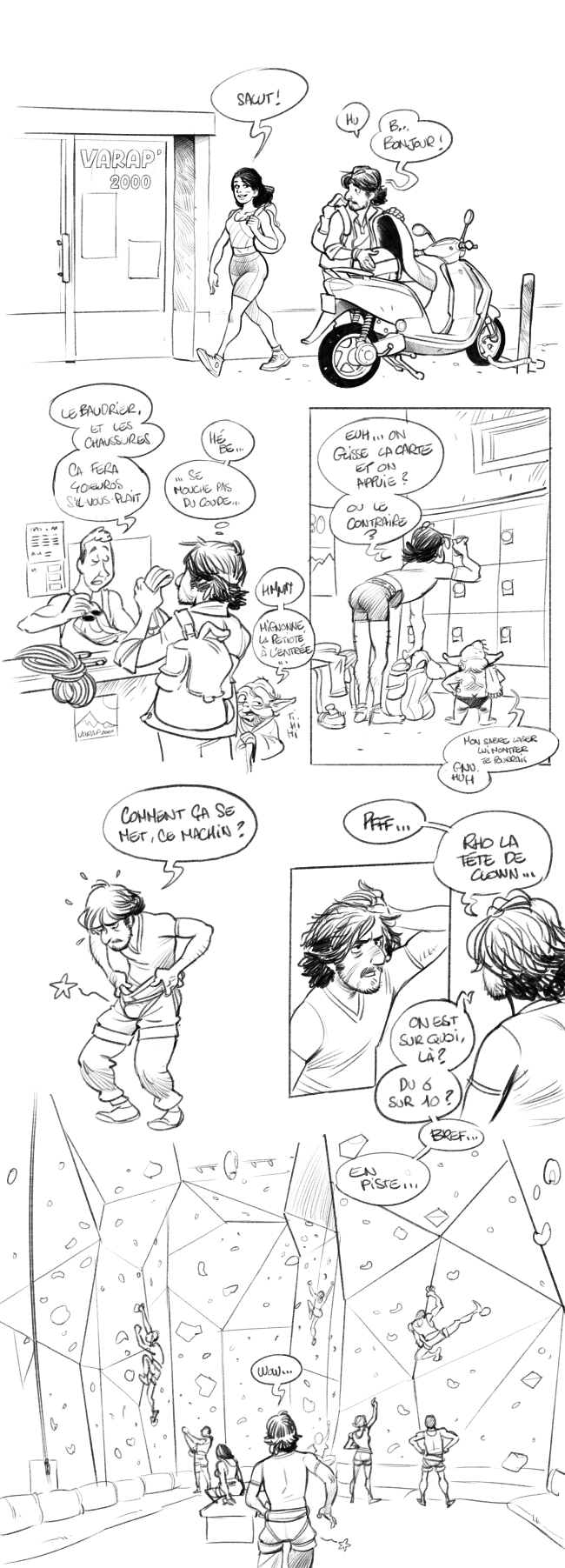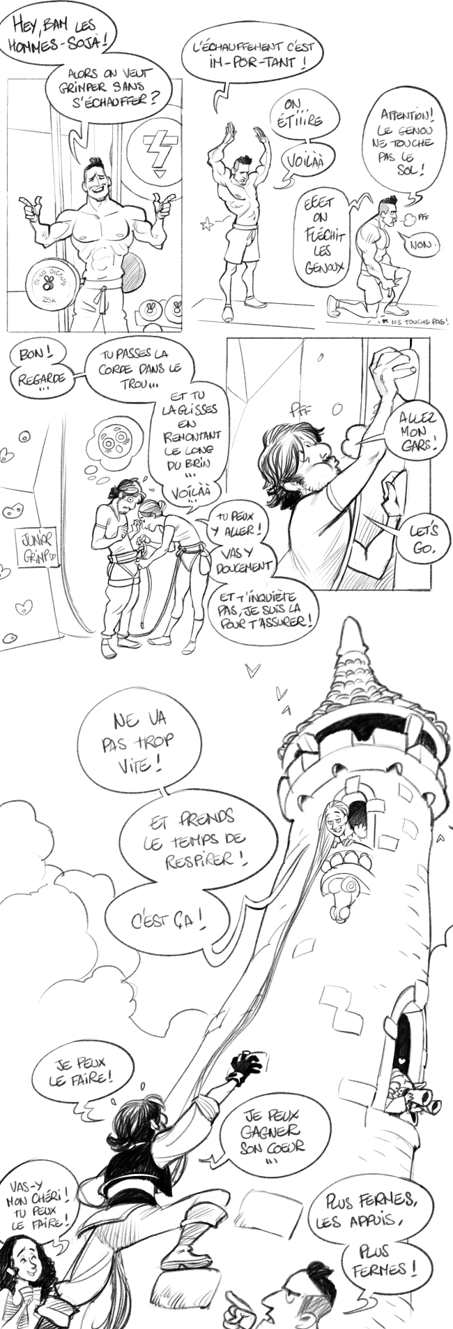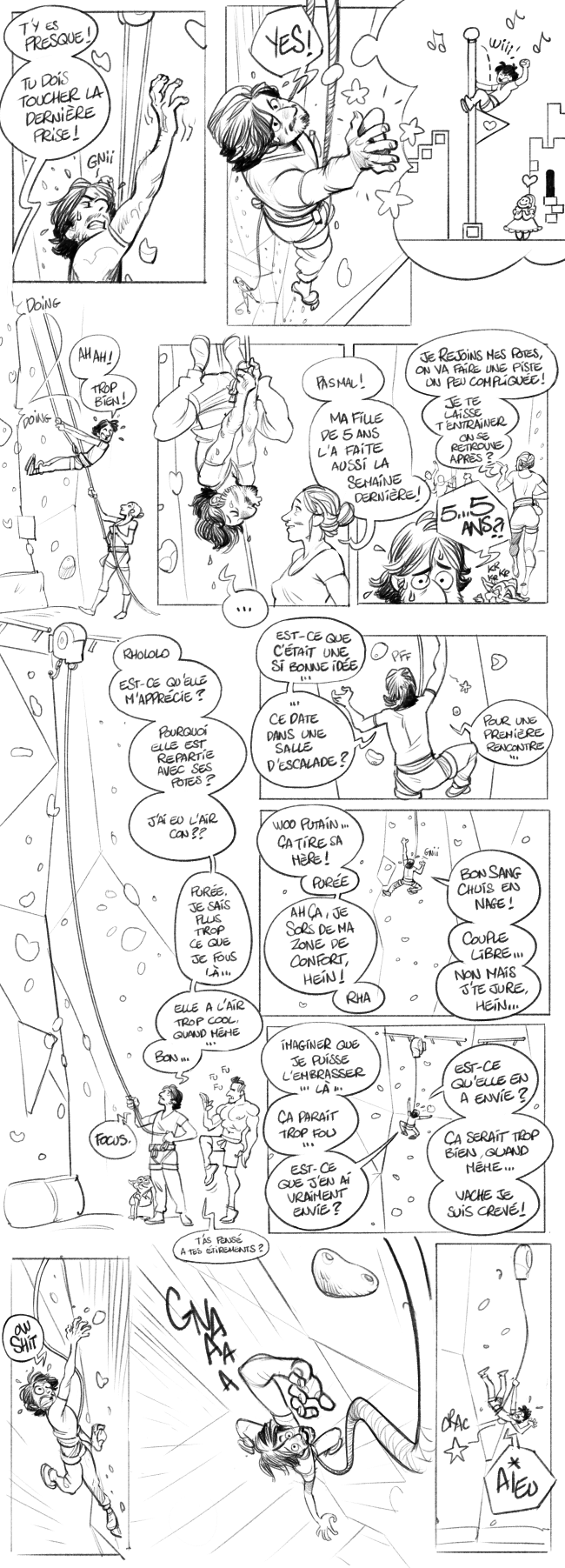 Oh nooon, je ne m’attendais pas à ce que ça se termine comme ça ! Pauvre Reno, j’espère qu’il fera une retouche (et une nouvelle côte) au prochain épisode. En tout cas bravo, c’est hilarant et touchant à la fois, j’ai ri tout du long et je salue bien bas le courage de monsieur, parce qu’un date à base d’escalade, je ne sais vraiment pas si j’aurais pu. (… dit le type qui a essayé une fois de se mettre au roller par amour… bon, OK… Je vois ce qui peut amener à tenter ce genre de folie…)