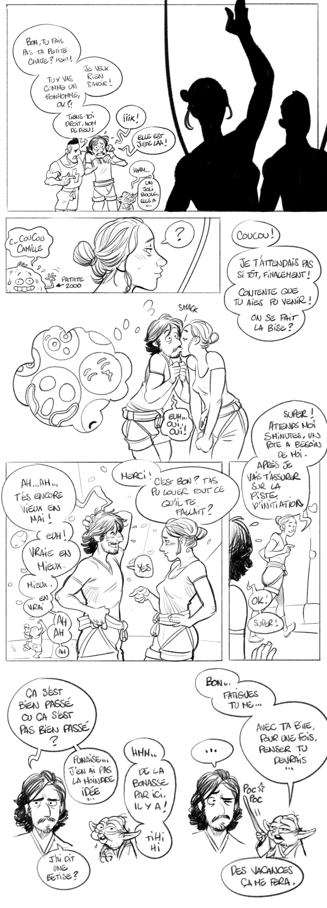 Rire: les nombreuses ref (marsupilami?) (la « raiponce » ne serait pas une allusion au gag de Galli où arrivé en haut le chevalier réalise que Raiponce a les cheveux longs?), les allusions à la con (tibo, yoda, soja)