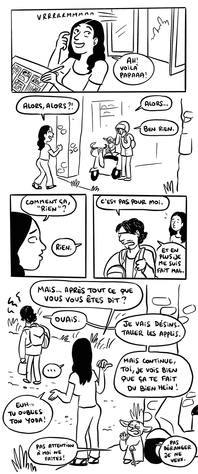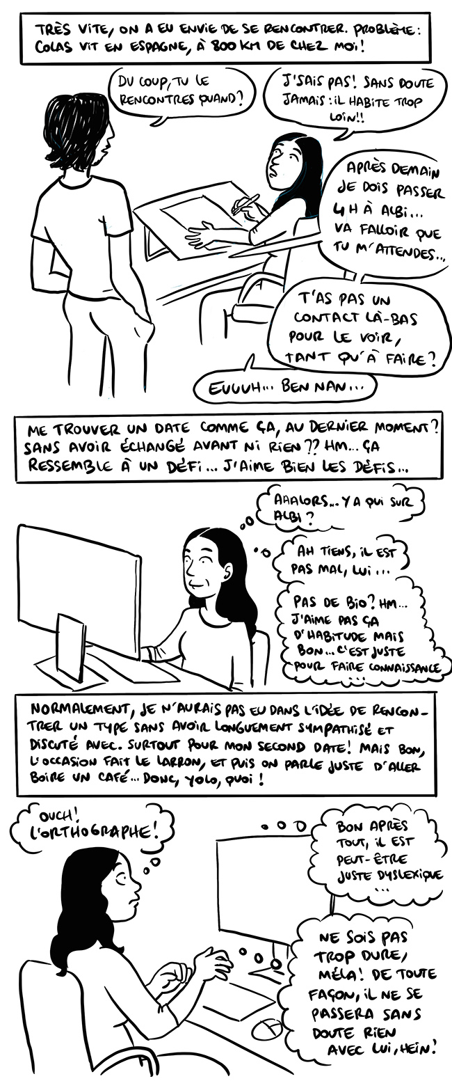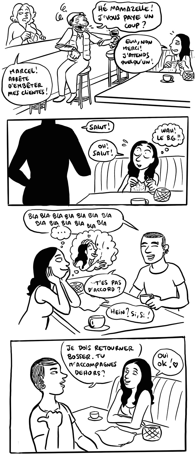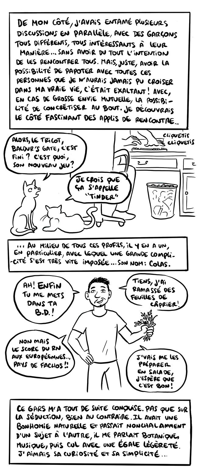 Coucou ! Je suis avec grand intérêt cette histoire. Nuance, humour, doutes, plaisir, échecs, bonnes surprises, frustration, tendresse… La condition humaine, quoi ! J’aime beaucoup ta narration et ton style graphique, et j’ai toujours hâte d’être à lundi. Continue, s’il te plaît <3