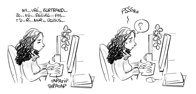 Je ne peux pas dessiner absolument tout. Il faut bien se dire que chaque jour, chaque instant, Reno et moi, nous parlons. Travaillant tous deux à la maison, nous sommes fusionnels et nous sommes aux cotés de l’autre EN PERMANENCE, toute la journée. Ce serait franchement lassant si je passais tout mon temps à décrire nos dialogues (je le fais déjà pas mal), mais sachez, chers commentateurs, et en particulier les plus virulents d’entre vous, que personne n’est victime ou manipulateur, ici. Personne ne « subit » les caprices de l’autre, comme le disait si justement Chills dans les commentaires, nous sommes acteurs de notre couple, nous ne sommes pas passifs. Toute décision, tout rendez-vous extra-conjugal est accepté en conscience par les deux parties. Bien sûr, il y a des déséquilibres, bien sûr il y a des moments durs. Bien sûr, le chemin vers une totale ouverture d’esprit, une acceptation des activités de l’autre, une annihilation du sentiment de jalousie (qui, honnêtement, ne sert vraiment à rien à part faire souffrir et nous rabaisser !) n’est pas simple, il y a des hauts et des bas. Mais ce n’est pas parce que ce n’est pas simple que c’est dramatique.