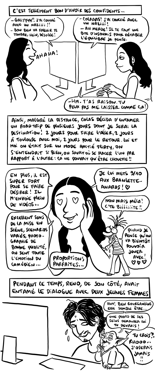 J’insiste aussi sur le fait que te reprendre qd tu finis par craquer et par répondre un truc énervé à quelqu’un qui ne fait que t’insulter depuis le début de cette bd, c’est pas très juste. Tu es humaine, ce que tu te prends c’est pas humainement supportable, et si tu as besoin d’insulter quelques personnes qui le cherchent bien de temps en temps, franchement moi je trouve ça libérateur aussi. J’ajoute que ta réponse énervée m’a fait du bien, ça me fait mal à moi aussi de voir tous ces commentaires injustes que vous vous prenez Reno et toi