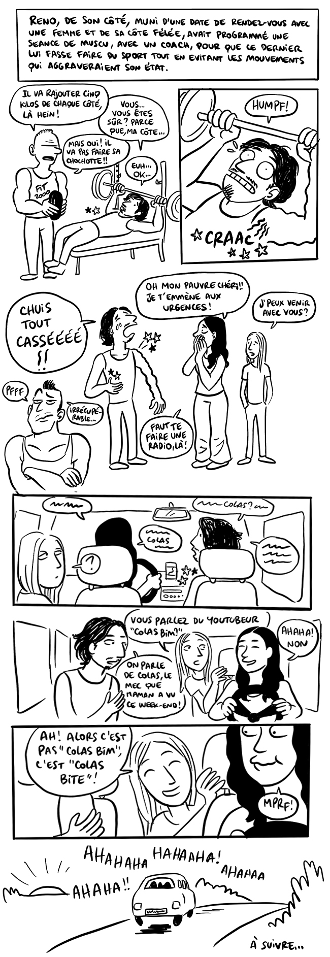 Il est con, ce coach ! On fait pas faire du développé-couché avec une côte pétée. J’ai déjà eu des côtes cassées, le sport ç’a été no way pendant un moment, je pouvais même plus éternuer sans agoniser interminablement.