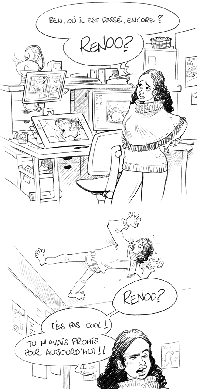 J’adore aussi la manière dont Reno s’est dessiné accroché au plafond. Tu t’es inspiré de quel animal ? Au pif je dirais « un chat » car tu me fais penser à un chat terrifié qui littéralement grimpe au rideau.