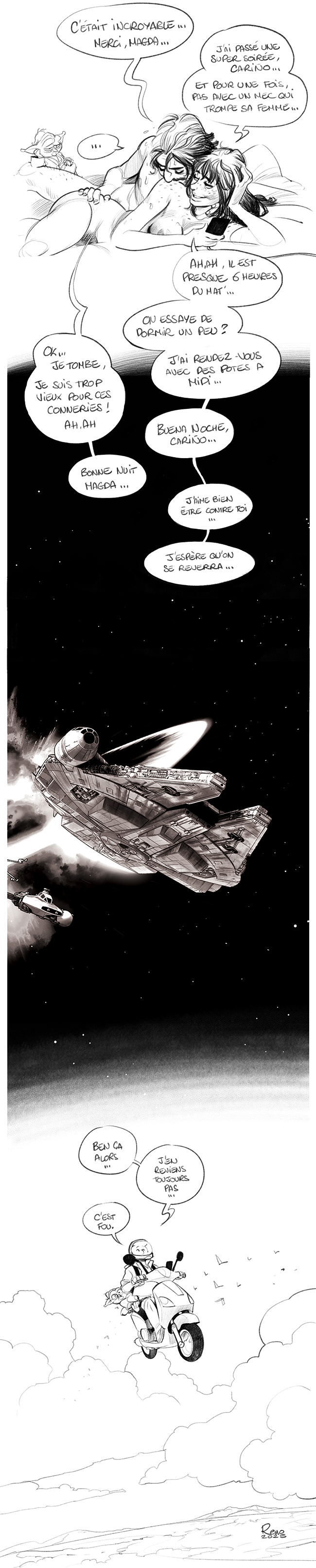 Pour conclure, les trois dernières cases sont gigantissimes : les deux corps en sueur, le Faucon Millénaire et le scooter sur son petit nuage, sont trois visions totalement différentes de la même réalité, et qui, pour les deux amants comme pour nous, s’exprime par ce mot si simple et si indispensable : merci. Mais l’image qui me touche le plus, c’est celle de Magda rougissant (en noir et blanc, excusez du peu) : « Pas mal… je crois… » ; la lolita croqueuse d’homme se fendille et laisse apparaître une midinette au cœur (corps) d’artichaut, certes, mais cherchant quand même la reconnaissance et l’attention.