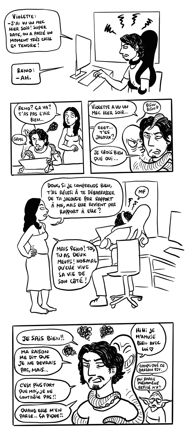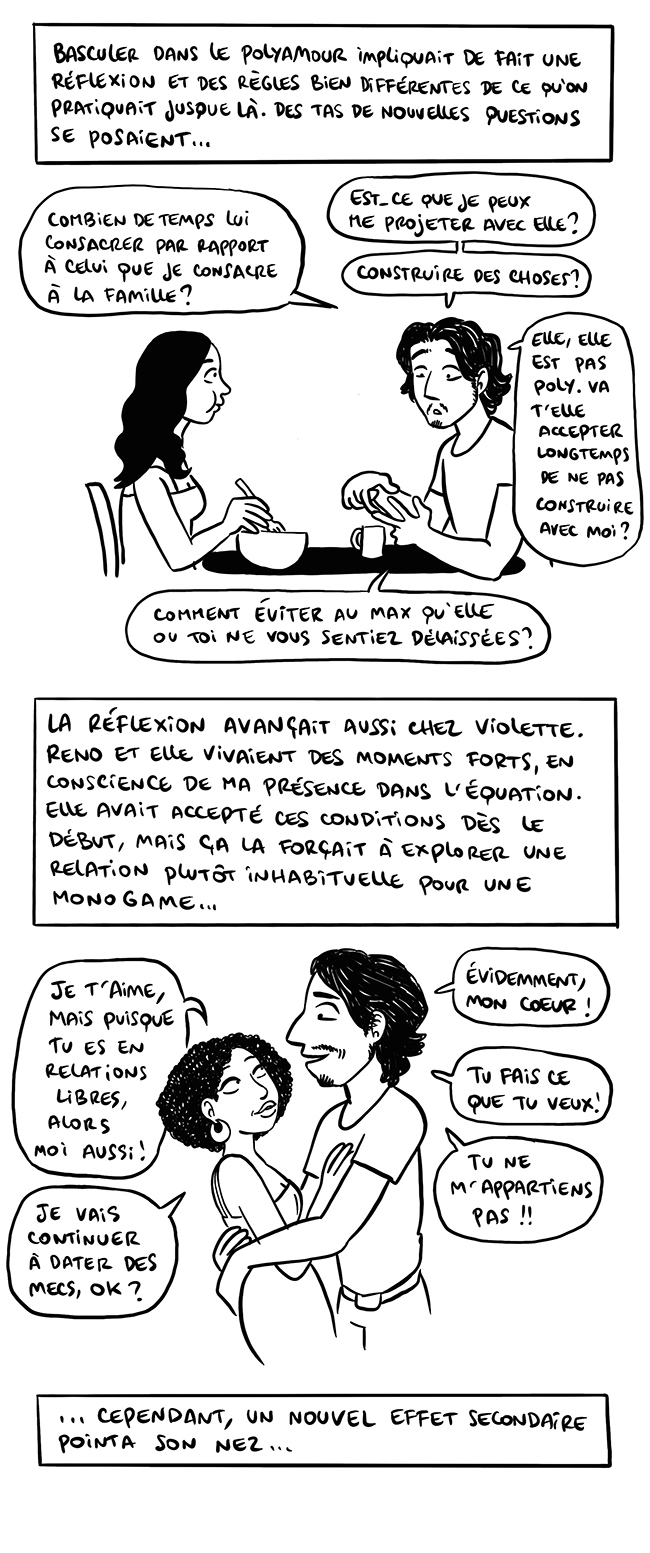 Personnellement, ce genre de complications constitue la raison principale pour laquelle je me dis que le couple libre, ça ne pourrait pas marcher pour moi. Par ailleurs, j’espère que vous ne prendrez pas cela comme un jugement, mais en toute bonne logique, si Violette n’est pas polyamoureuse, le fait qu’un jour ou l’autre, une séparation survienne entre elle et Reno, ça me semble inévitable, même si ça peut survenir après de belles années et de manière apaisée.