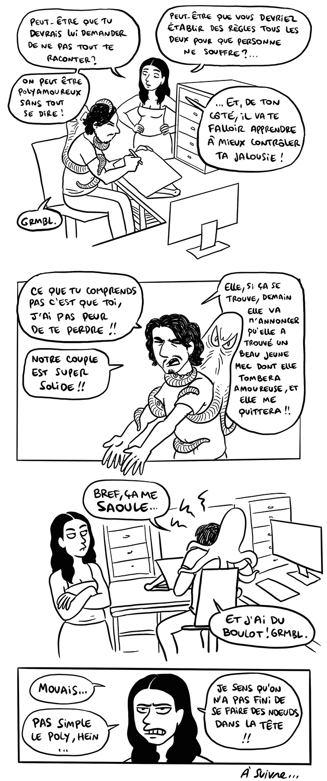 En tout cas, merci pour cette planche ! C’est effectivement rassurant de voir qu’au final, on est tous humains, avec nos faiblesses, nos paradoxes etc. Etant moi aussi très peu sensible à la jalousie de ce style, quand j’étais plus jeune, j’avais tendance à voir tous ceux qui l’étaient comme inconsciemment full toxiques, mais avec le temps je comprends que c’est un sentiment qui peut être très dur, voire impossible à complètement déconstruire.