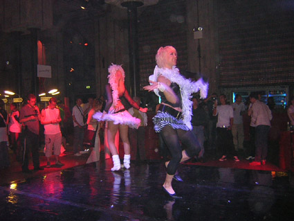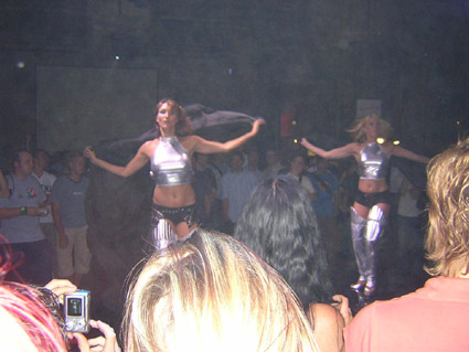 Après 2h de car, nous v’là arrivés à la soirée : ambiance boite de nuit, consoles partout, petite scène centrale avec des nanas qui dansent…